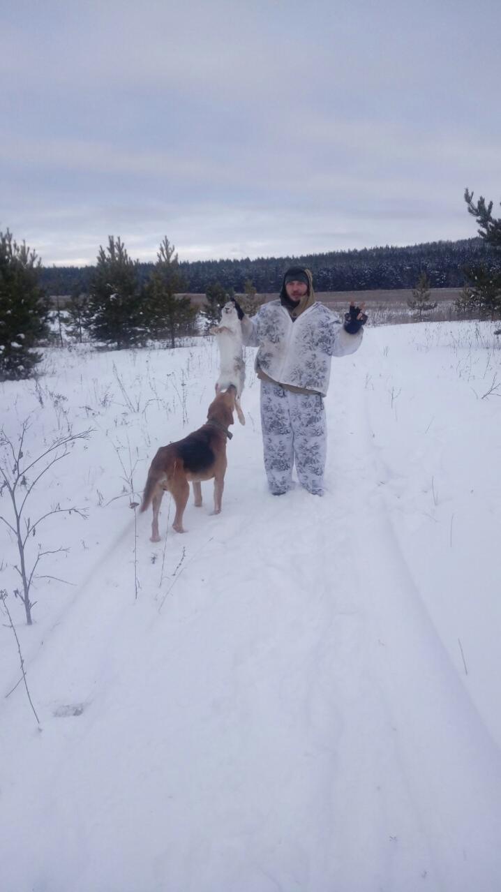 Следов не было и погода не благоволила, но подняли двух косых и один уехал с нами.