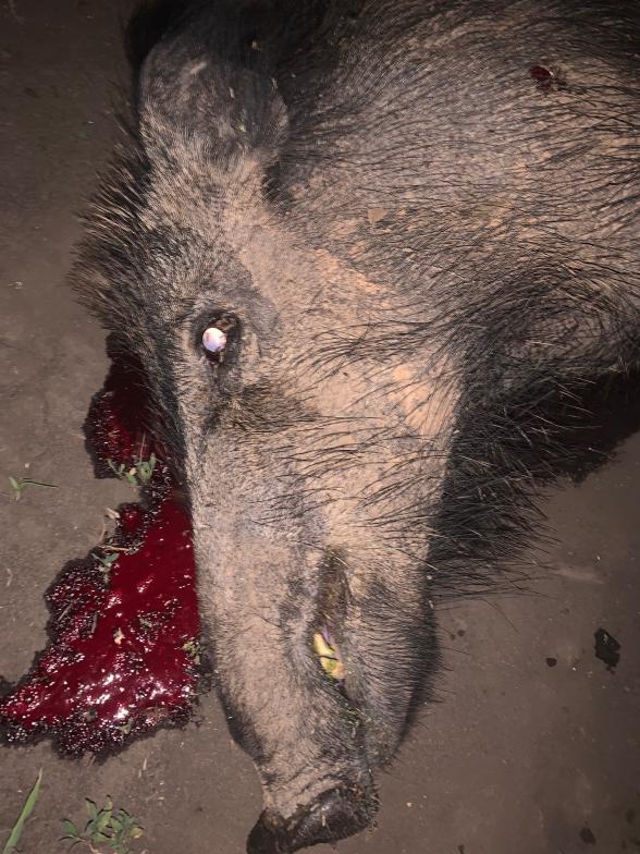 Охота с тепловизором очень удобна и эффективна, но вот идентификация зверя в густой пшенице крайне неудобна – не видно в траве пол животного. Кабан двигался жуя пшеницу медленно в нашу строну, а мы все не стреляли, 220 метров – 180 – 170… Секач подошел на 121 метр и совершил роковую ошибку для себя и удачную для нас, он вышел из пшеницы и пошел по краю поля, тем самым четко обрисовав в прицеле горб и другие отличительные признаки самца ))). Выстрел… Попадание чуть за шею, в край лопатки – лег на месте.