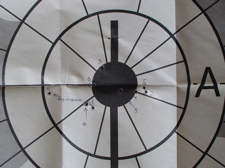 Далее. Мишень была 100-дольная для дроби, но мне главное было получить стабильные попадания в черный кружок по центру, чего раньше не было. Первоначальная ошибка при прошлой пристрелке лежа с упора была в том, что опирал карабин на не на цевьё, а, недомыслие попутало, на ствол в районе мушки (для устойчивости во время прицеливания). Словом, избавился от двух порочных факторов и приступил к вводу поправок в прицел, чтобы выйти на ноль на 100 м. Получилось не слишком адекватно вводимым поправкам. Причин может быть несколько: и не супер стабильные по качеству патроны (S&B), и порывы ветерка, и жесткий спуск, и не слишком прочный стол под станком. Больше досадовал на тяжелый спуск. Что нужно подшлифовать в УСМ, чтобы уменьшить усилие?