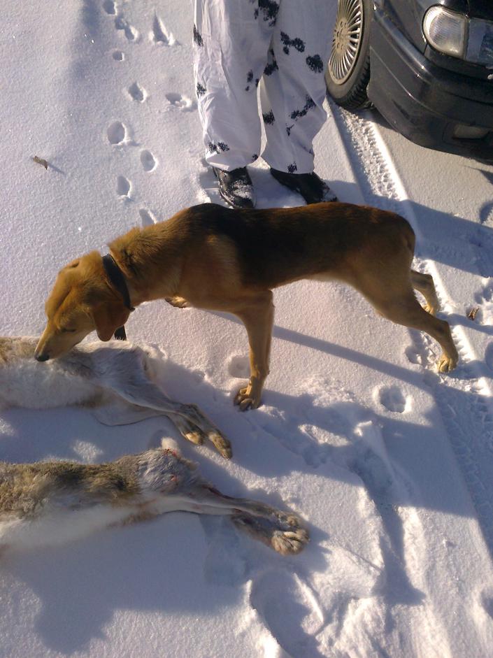 Сегодня объединили усилия с форумчанином C@LMAR (рад знакомству, надеюсь еще увидимся). Результат так сказать налицо. Свежий снежок дал о себе знать. Заячий малик как печатный. Только съехали с дороги и сразу двоечка и скидочка в пашню. Решаем искать. Пройдя метров 150 ухатый поднимается в 10 метрах от нас и переходит в нашу копилку . На часах 08:20, весь день еще впереди. Решаем проехать дальше. Проезжаем метров 70, не больше и видим свежую жировку, но видимо пока раскладывались и заряжались косой благополучно свинтил. Ставим собак и начинаем гонять. Мой Бушуй категорически отказался работать в паре с Лехиным Марсом. Вдвоем доходят до первой скидки и возвращаются. Пришлось идти самим. Косой напутав в овраге перешел лесополосу (мы его перевидели на выходе) и скрылся в лощине, а дальше видимо пройдя низинкой благополучно вышел Лехе за спину и мирно за ним наблюдал , а затем после выстрела благополучно скрылся. Вобщем худо бедно нашли и подняли мы его на краю оврага в небольшой посадке. Собакен взяв след (три раза распутав зайкины хитрости) выгнал его на круг, где зайка был добыт. Вот один собакен работает, а смычком ну никак не хочет. На часах 12:20. Попили Лехиного кофейку , зачехлили ружья и решили проехать по угодьям, глянуть места обитания заек. После чего благополучно распрошались. Погодка сегодня была просто чудо, удовольствия вагон и приятный гул в ногах тоже присутствует. Охота состоялясь