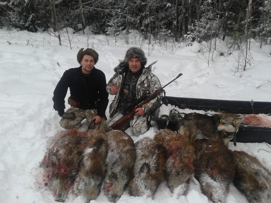 В праздники вырвались на охоту в Кировскую область, как всегда в хорошей компании не надо ничего объяснять и говорить что кому делать все ка-то машинально и непринужденно! Вечером добродушно встретили Кировские егеря и мы улеглись спать ,а утром уже мчались на снегоходах к заветным лесам и пролескам. Поиск зверя был не долгим пока мужики обрезали квартала мы даже чай не успели допить ,как команда по "машинам" через 5 минут уже все на номерах в ожидании загона.Через 30 минут первый выстрел и пошло поехало.... одного подранка не стали добивать привезли всех собачек чтоб малость потренировались на нём, потом пошли в лес собирать трофеи ,затем фотки раздела и на базу,итог первого дня 5 шт. Один секачок был взят с 270 метров