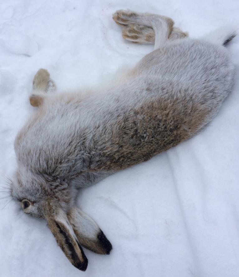 2 следа - 2 зайца, хотя с утра ничего не предвещало хорошей погоды и охоты. Первого погонять пришлось чутка, второго прям с лежки взяли накоротке, метров 100 по следу прошли, без скидок лег.