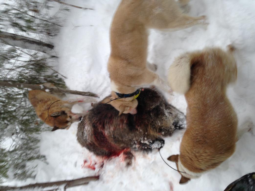 Помощники так злобно дерут битого зверя ,что у лося полспины эпилировано было до гладкой кожи, пока их не оттащили)