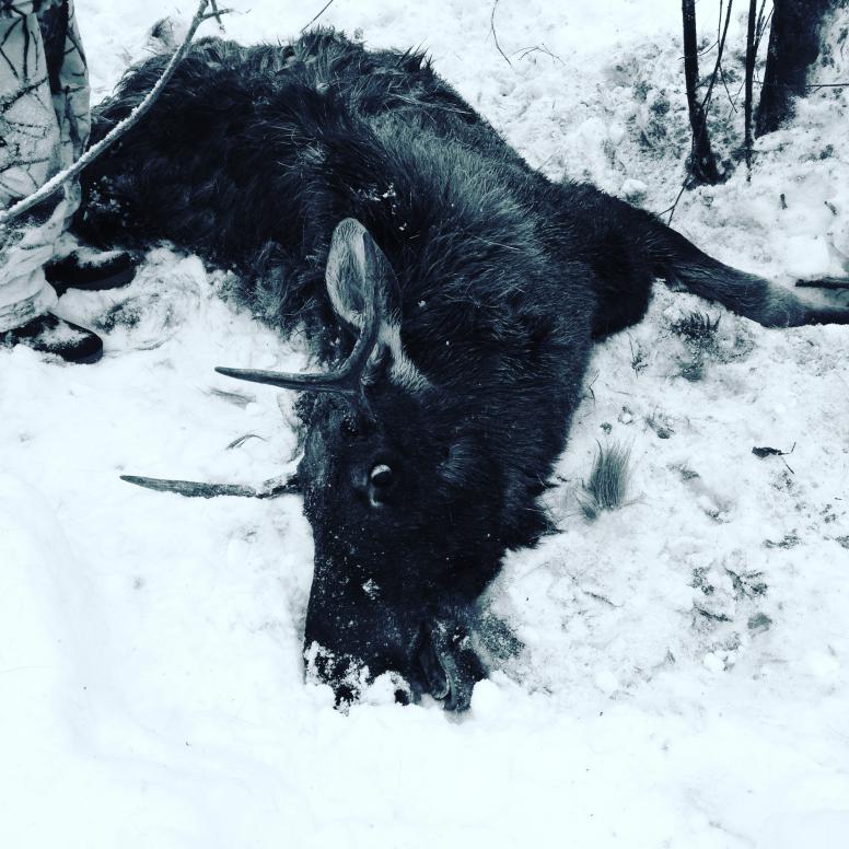 2й день-целенаправленно по лосю.Долго обкладывали, каждый раз сохатые или отворачивали от линии стрелков, или проходили между нами.В обед все же удалось взять бычка.Подранили в ляжку , потом собаки держали его,и добрали с 3006. Упал в крепком буреломе..Хорошо, что была бензопила, проложили дорогу и вытащили целиком.Охотой довольны)