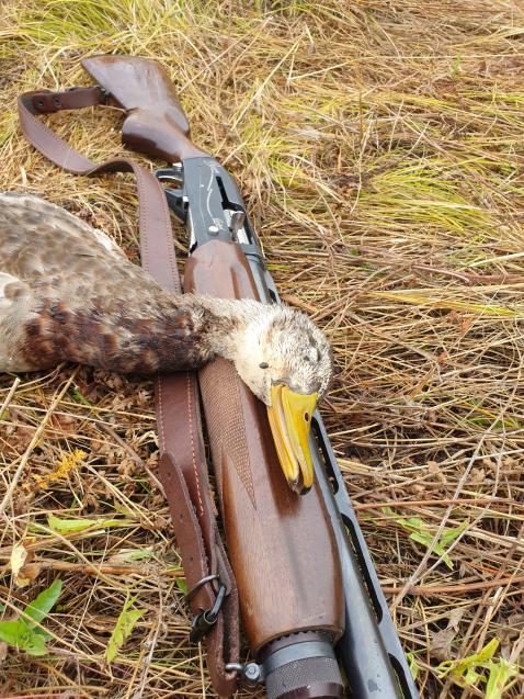 Утрянка была вялой, но одного селезня всё же удалось заманить, откликнулся на манок, летел радостно жвакая. Почти полностью перелинявший, только голова не окрасилась ещё