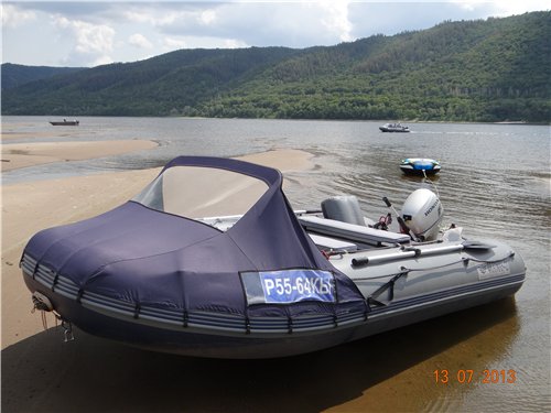 Была Флагман-420 с НДНД +Хонда 20, а сейчас Витязь-430+Тоха 30, с жёсткими полами, баллоны больше и ткань пвх толще. Жёсткая палуба, лучше, да и килеватость хорошая, по волне идёт уверенней, не кидает.