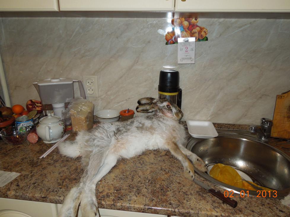 емаё! ну вот и русака пришлось обдирать)) тесть в деревню седня ездил и пока машину откапывал, собаки русачка пригнали. ща, со слов тестя-" стою, слышу гон. смотрю кобель соседский (пегаш с примесью легавой) на перекрестке стоит ни жив , ни мертв, устремленно вперед смотрит. пошел глянуть и замер-заяц чешет прямёхонько на собаку, а тот не шелохнется, стоит. метра за два кобель прыгает в сторону зайца, тот успевает в сторону соскочить и уходит на другую дорогу, а там "шарик" или "тузик", дворняга вобщем, за две минуты до этого туда убежал. смотрю заяц, видя шарика (ну или тузика), юзит всеми лапами и в момент, когда пытается скинуться в сторону, попадает в зубы кобеля... щелчек, писк и всё. через минуты три доходит гончак, который гнал этого зайца." тесть, чтоб не разорвали зайца, туда. забрал, через забор кинул и дальше откапывает машину и хозяина собаки, гнавшей зайца, ждет. и эт все около дома, прям на перекрестке произошло. не дождался. так никто и не пришел.
