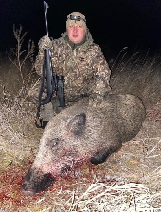 Упор. Предохранитель. Камеру на прицеле включить, для запечатления. Прицелился. Расстояние удобное, кабан не большой, никаких проблем… Выстрел по голове и один из секачей завалился на месте, а второй побежал спасаясь в траву и болото…