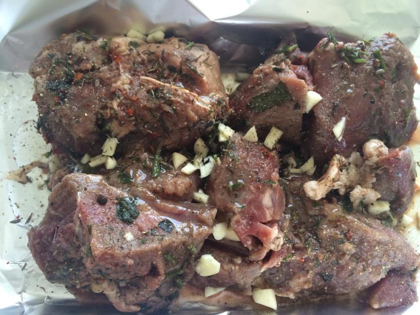Ну и я отмечусь пожалуй... "Узелки" Мясо кабаненка маринуется в вине с травами и специями (собственно у Жени Толстова взял из последнего рецепта) - на сутки замочил. После вытащил, осушил, нашпиговал чесноком и добавил Темьян и перец, уложил в фальгу, завернул первый узелок.
