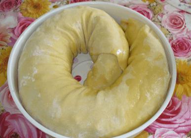 Приготовление: Замесить крутое тесто, которому дать отдохнуть, пока готовим начинку. На крупную терку натираем 2 моркови и 2 головки мелко порезанного лука, слегка обжариваем. В мясной фарш добавляем специи, соль, можно потереть картофелину. Тонко раскатываем тесто, выкладываем мясной фарш, на него -овощной. Сворачиваем все в плотный рулет, укладываем на смазанную маслом пароварку (можно выложить на фольгу и запечь в духовке). В воду добавляем лавровый лиcт, душистый перец и немного соли. Варить 40 минут. Выложить в блюдо, полить маслом. Подать томатный или сметанный соус.
