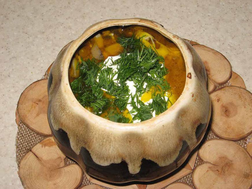Ингредиенты: 1 цыпленок (200 г), 140 г картофеля, 50 г репчатого лука, 25 г моркови, 10 г кулинарного жира, 5 г сушеных белых грибов, соль, 10 г сыра, зелень петрушки. Для соуса: 75 г сметаны, 10 г муки, 75 г грибного отвара, соль. Приготовление: Обработанного цыпленка разрубить на куски массой 40-50 г. Сырые картофель, морковь, лук порезать кубиками. Лук и морковь спассеровать отдельно друг от друга. Подготовленные грибы отварить, нарезать соломкой. Куски цыплят положить в горшочек, добавить сырой картофель, пассерованные лук и морковь, грибы, залить сметанным соусом и тушить в духовке 30-40 минут. За 10-15 минут до окончания тушения посыпать тертым сыром. Для соуса муку спассеровать без жира, слегка охладить, влить горячий грибной бульон, вымешать до однородной массы, варить 20 минут. В конце варки добавить прокипяченную сметану, соль, варить еще 5 минут, процедить. Подать, посыпав зеленью петрушки.