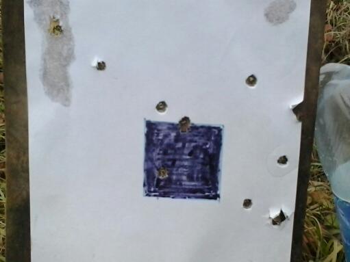 Мишень, сторона черного квадрата 5 см. Три выстрела по квадрату, два попадания в квадрат, одно рядом. Остальные отверстия пристрелочные.