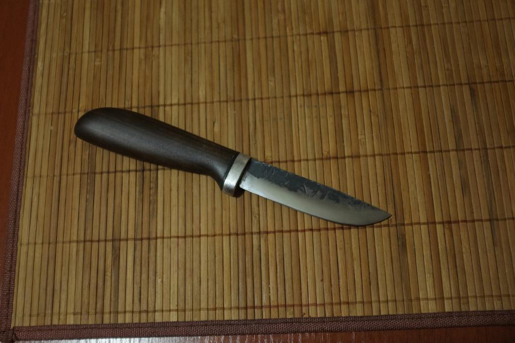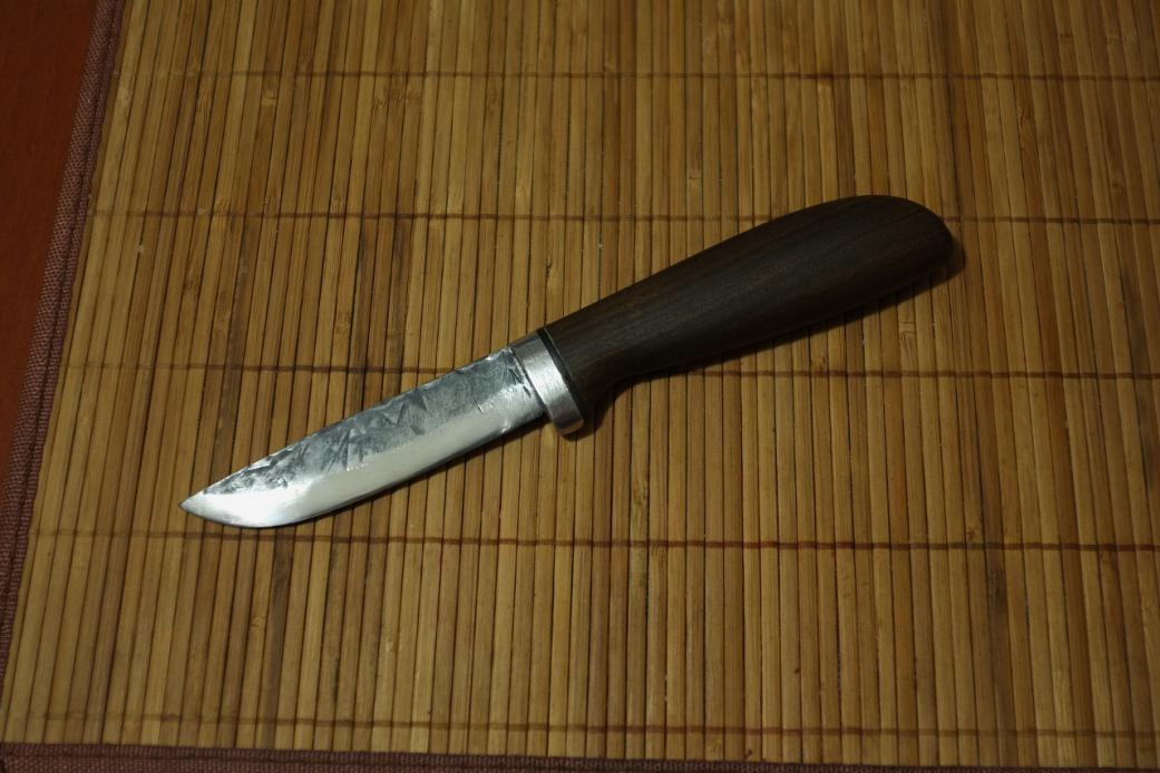 Клинок кованный из арматурины. Закалка в масле. (по надфилю твёрдость не более 55-56) Всадной монтаж. Рукоять орех, пропитка льняное масло с сикативами. Нравится или не нравится, отписывайтесь не стесняйтесь и не ленитесь. )) Интересно мнение общественности. Это мой первый опыт создания ножеГа с нуля. |