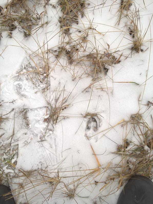 В прошедшую пятницу 2 часа гонялся за зайцем по джунглям из осоки. След из поля привёл меня к озеру. Скидка была прямо в заросли. Поднялся он от меня в 5-7 метрах, но я его не вижу а только слышу как тростник хрустит. Спрыгиваю с лыж и за ушастым в дебри. Пробираться сложно ,но и заю не легко , он не скачет а ползёт. На открытое место вылезет и метров через 100-150 опять в джунгли. Намотали так мы с ним км3-4 и я сдался. Я этого кустодрота так даже и не увидел воочию, хотя был впереди меня все время не далеко. Умотал он меня так ,что до машины я еле доплёлся. Сегодня решил его навестить. Из дома выехал в 7-45. Погодка чудная. Но в 8-00 снег как будто включили. Следы все позасыпало.Зайчика я не нашёл, зато увидел два ночных следа от хрюнов. Судя по копытам -не мелкие. Как то очково стало лазить по этим местам с 1 в стволе, да и снег валит . Решил возвращаться домой. В следущий раз зайца навещу.