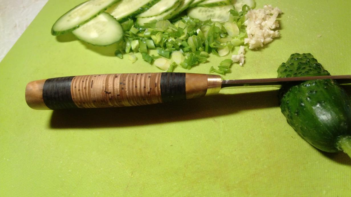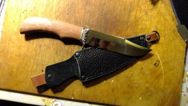 Вот такой ножик получился,задумки были другие,но опыта не хватило и спешка подвела. Спуски на клинке сделал мой друг,остальное сам "намастерил". С заточкой вообще проблемы...но режет и не плохо! Хотел рукоять полностью с бересты,но половину нарезанных пластин от браковал,при стяжке села и пришлось кожи добавить! Ну как то так получилось,критикуйте!!!