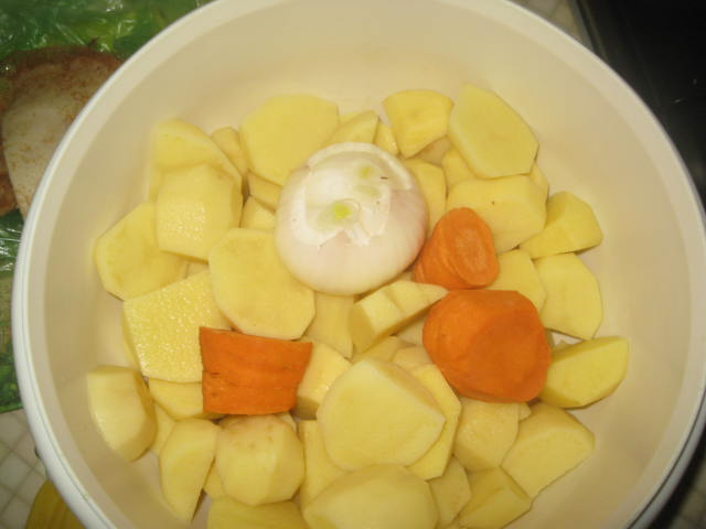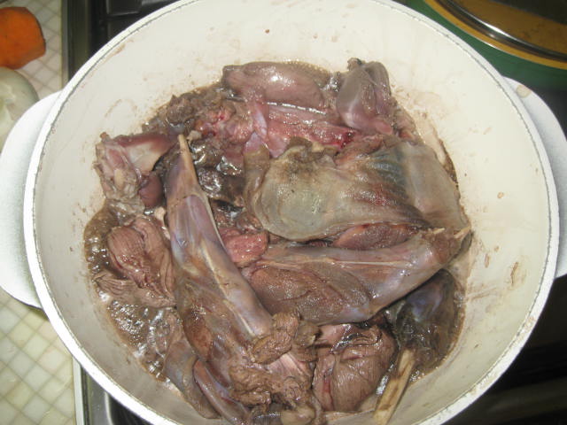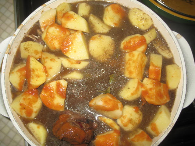Решил добытого в субботу зайца не морозить,а сразу приготовить.Ночку зайчик покупался в xолодной воде.Утром порезал на куски,помыл и залил xолодной водой,слегка разбавил виноградным уксусом.К вечеру обжарил на косулячьем жире мин 15,затем добавил луковицу,крупно порезанные картофель и морковь,посолил,лаврушка,смесь перцев,немного соевого соуса и домашнего кетчупа.До верxа добавил кипятка.Довел до кипения и на самый медленный огонь на 2 часа под крышкой. Зазевался и сам без ужина чуть не остался.