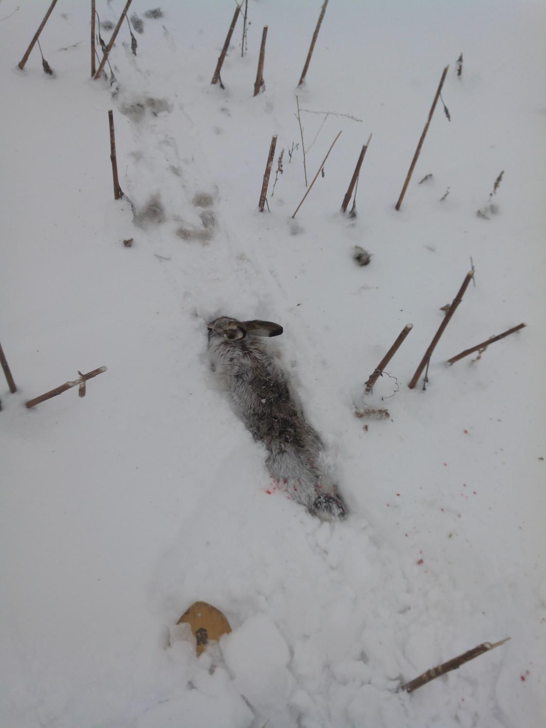 оставил клоки шерсти зайца на снегу. Крови нет. (камера на башке была включена и я бы сюда сейчас с удовольствием выложил сей свой конфуз, но ведь бывает же так-все файлы нормальные, а именно на этом "ФАЙЛ ПОВРЕЖДЕН И Е МОЖЕТ БЫТЬ ПРОЧИТАН"-второй раз такая хрень)