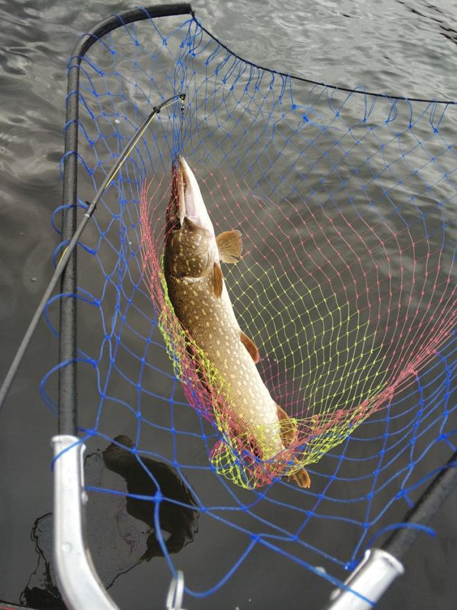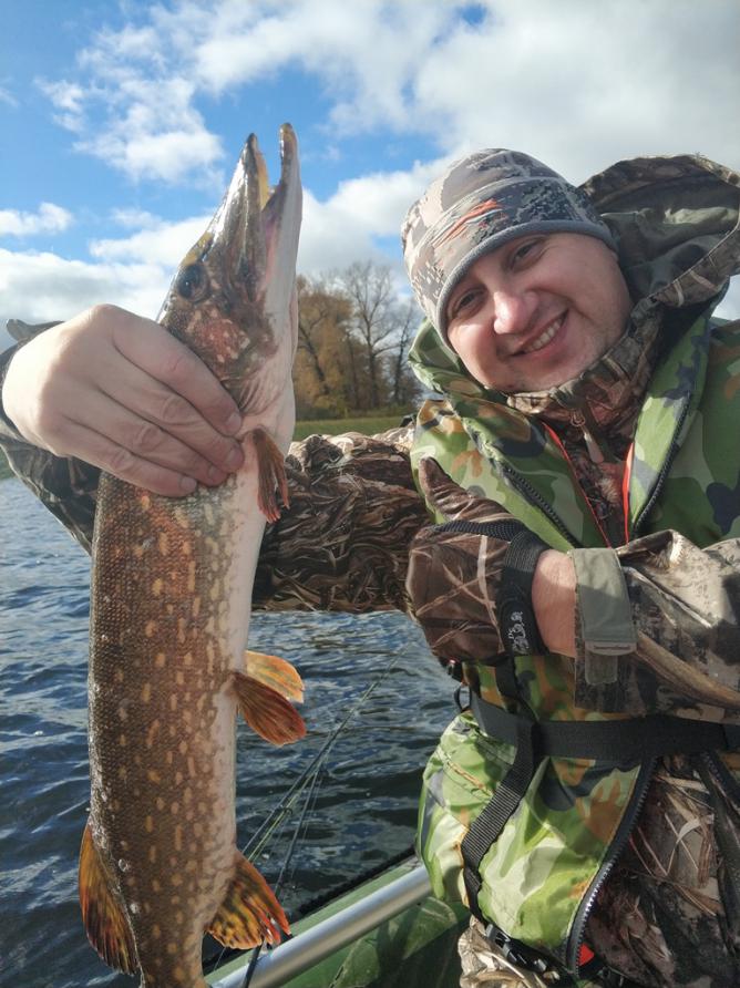 Снимаюсь с якоря и переезжаю на другую точку в паре километров. С помощью эхолота нахожу бровку и встаю так чтобы быть поближе к фарватеру и одновременно не попасть под снующие туда сюда баржи. Несколько забросов в сторону бровки и чёткий удар. Начинаю вываживать. Фрикцион стараюсь держать отпущенным поэтому рыбаки вокруг слушают его треск Через пару минут подвожу к лодке щуку. Рыба тут же показывает мне как она умеет делать свечи, но засеклась капитально и расстраивать меня не стала. Тут я понимаю, что подсак остался в машине. Поэтому пришлось дать рыбке успокоиться и вытащить её в лодку за шнур. Первый приятный экземпляр отправляется в садок.