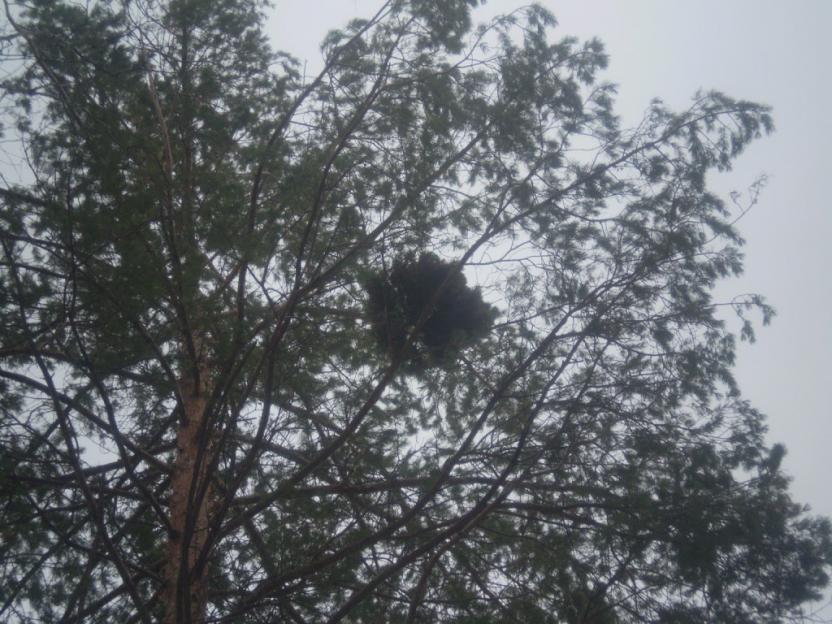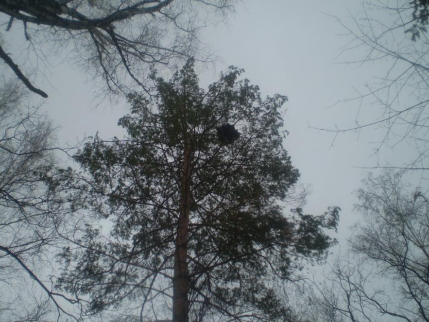 Кто как думает, чье это? Следов вокруг никаких, может дятел какой залетный гнездится? Видел такую-же халабуду, только покруче, побольше в смысле. Чьих клювов это дело?