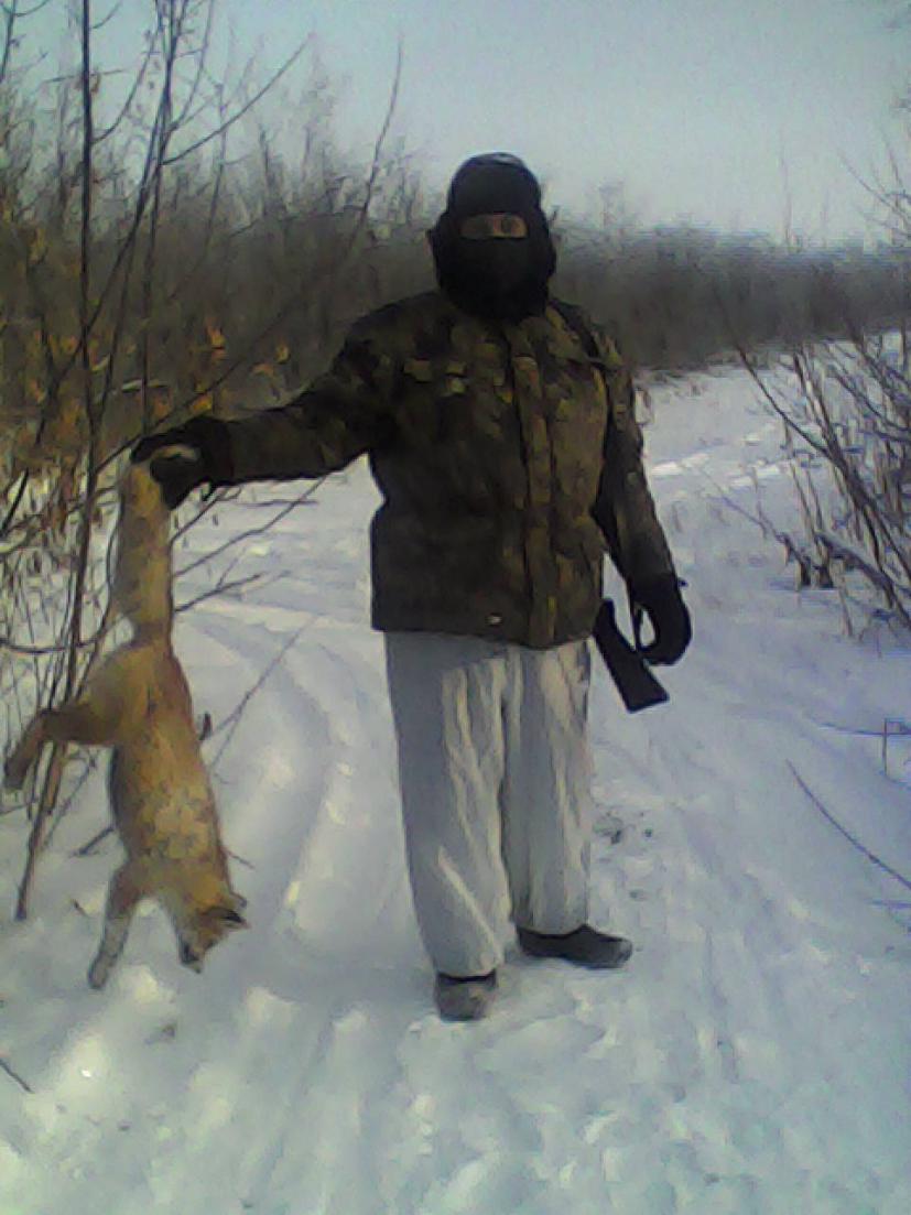 полдня седня по семечкам пролазил опять и снова без подъема. на первой фотке вдоль леса неубранные семечки, кабану оставили. и вправо еще раз пять по столько. плюнул на все, зачехлился, в сторону дома поехал. еду смотрю справа следок присыпанный, решил проверить. метров 300 прошел, смотрю петлять около кустов начал. фотик на видео включил, думаю щас весь процесс сниму, если повезет может подранка сделаю, собаке догнать потрепать. кобель в кусты потянулся, я тоже решил со следа уйти в сторону. и выключил фотик. думаю подъем услышу, включу. блин, смотрю косой вылетает и на меня бежит. а собака все еще ищет, не видит, что подняла. в руках и фотик, и ружье. че делать?! с двух рук два дела сразу не сделаю. бросаю фотик, благо на шее шнурок. БАХ! бежит! даже не дрогнул. тут уж не до подранка, второй раз БАХ! бежит блин! думаю не он косой, а я. к дороге бежит, а на той стороне далеко я за ним не уйду, тут по снегоходовому следу без лыж можно ходить, а там по колено. стою соображаю че произошло. смотрю вслед этому зверю, бежит, даже не хромает. метров сто пробежал и чет правое ухо ронять начал. потом еще метров пятьдесят пробежал налево завалился и биться начал. кобель видимо решил проверить че эт хозяин палит тут. ну и молча догнал, но заяц уже скончался.