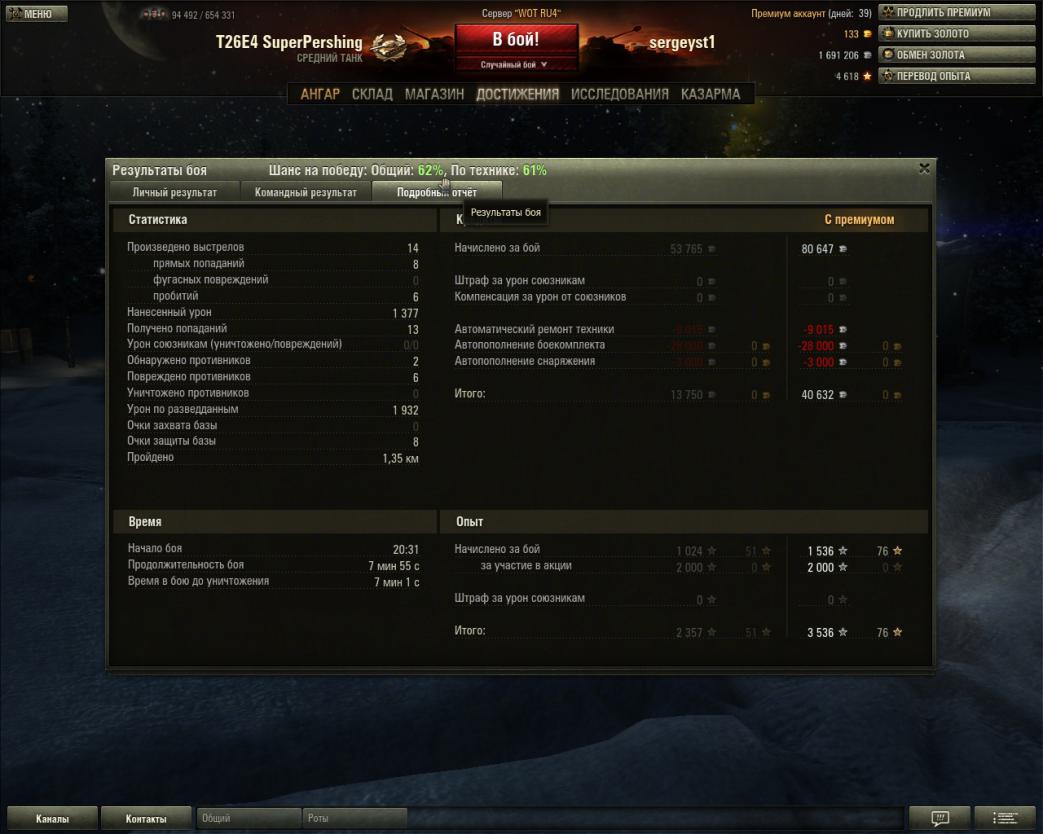 Победа! Бой: Хребет Дракона 9 января 2013 г. 19:59:37 Танк: T34 Получено опыта: 4*038 (x2 за первую победу в день) Получено кредитов: 122*049 Достижения в бою: «Снайпер» |