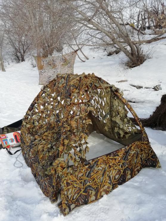 Имею вот такую палатку. Раскладывается каркас, сверху накидка из сетки. Мужики на встрече дали совет, что она слишком просматривается и что нужно заднюю стенку заглушить. Вот думаю, одно или два окна заглушить? т.е. оставить обзор из трех или из двух бойниц? И чем заглушить? Мешковиной может? Ну а далее на лужу и обложу местной растительностью.