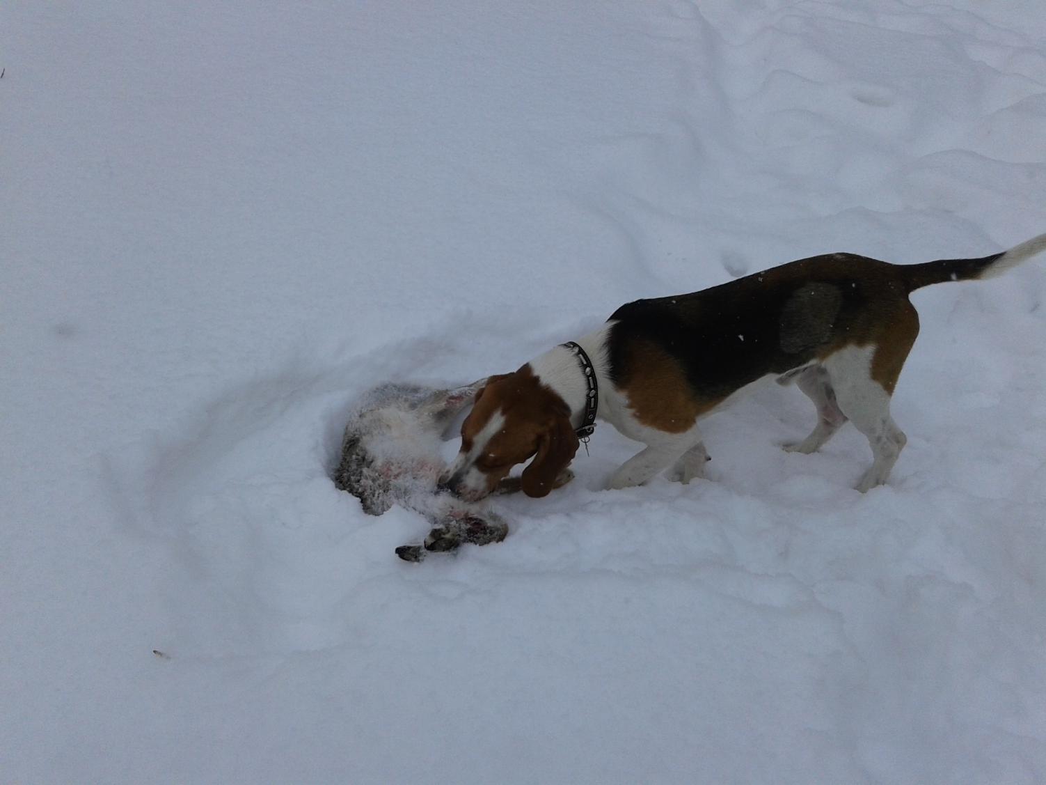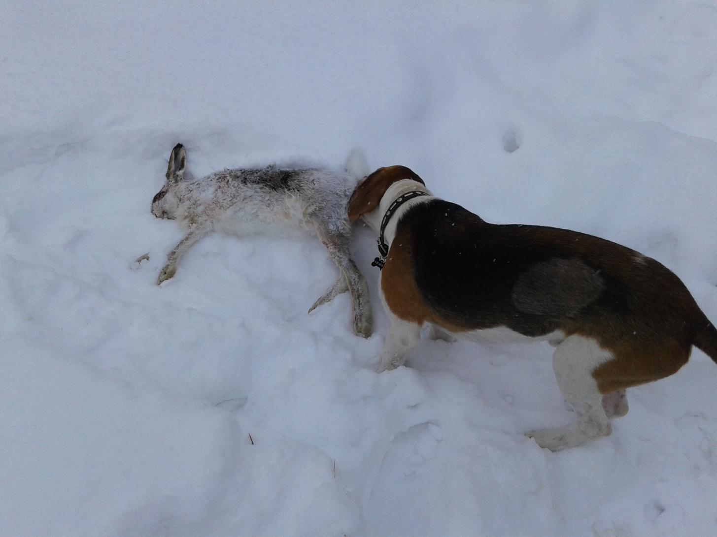 Я ушел на край посадки, подождал немного и решил прочесать то место где меня заяц постоянно кидал, прошел 2 поля, следов нет, когда подошел к краю второго поля увидел сдвойку, скидку и пошел по ней. Заяц поднялся метров в сорока и пошел сторону от меня, два раза стреляю, мимо. Заяц ушел по посадке в сторону компаньонов мой выжлец за ним. Выгнал на Виталия который оказался в нужный момент в правильном месте. Сообщение по рации взяли. Пока я дошел до них собаки уже работали по другому зайцу, но потеряли. Решили идти по этому полю поискать. На середине поля выстрел с лева и сообщение по рации, что заяц пошел на меня но не тот которого собаки потеряли, а другой поднялся. Вижу зайца, присел, идет на меня, но нервы не выдержали стреляю далеко и мимо. За что потом себя ругал, надо было подпустить тогда не пришлось бы его еще полтора часа крутить. Собаки пошли за ним, Зингер и Шума. Очень понравилось как работает молодая выжловка, идет быстрее наших Эстонцев по глубокому снегу. В итоге заяц вышел к платному пруду, там его Николай подранил и собаки выгоняют его опять на Виталия. Есть второй.