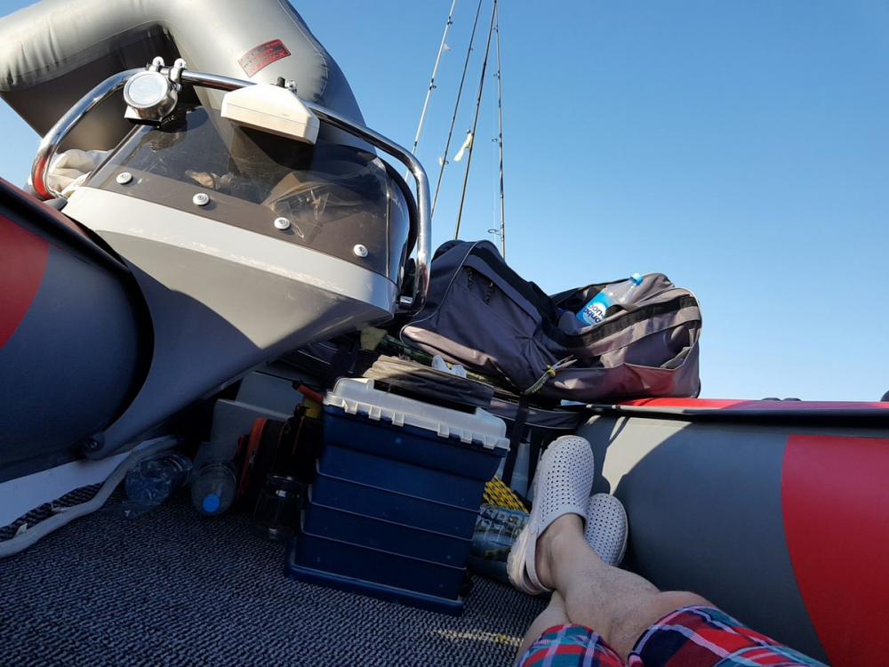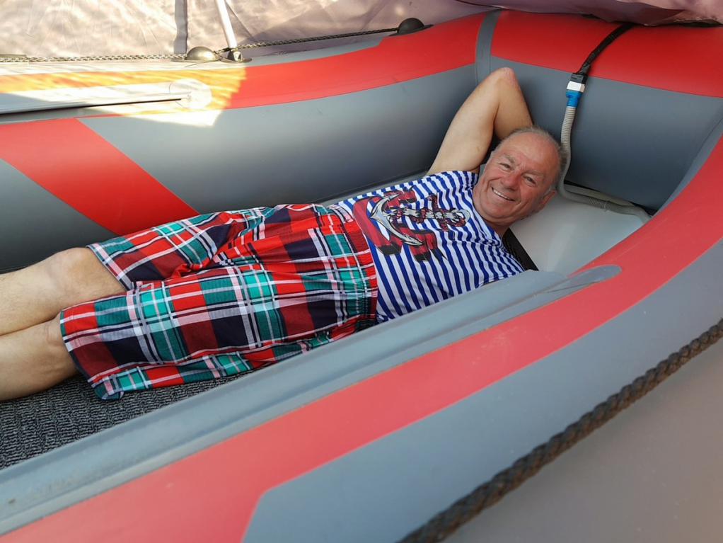 Сегодня закончил обкатку мотора, завтра техническое обслуживание. Если снять надувное кресло, можно и "прикорнуть", мой рост 172 см (до уровня консоли),но до рундука еще тянуться и тянуться...