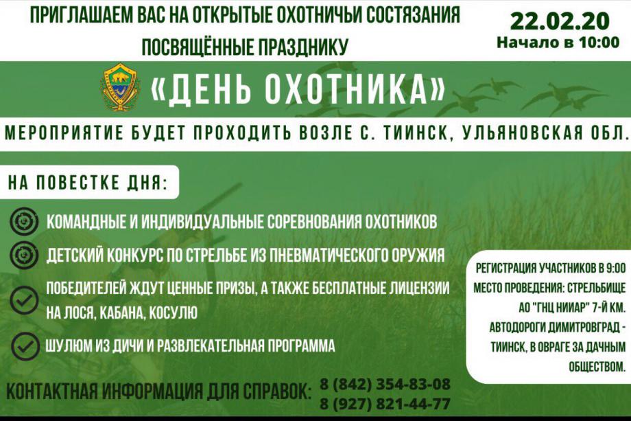 Уважаемые друзья, 22 февраля Ульяновское общество охотников и рыболовов, Мелекесское общество охотников и рыболовов и Администрация Мелекесского района, проводят праздник день охотника, посвященный закрытию сезона охоты! В программе командные, индивидуальные и детские конкурсы! Наш магазин "Оружейный двор" является генеральным спонсором данного мероприятия. Вас ожидают ценные призы - нож Fallkniven, пневматичеакая винтовка Hatsan, зимние сапоги Remington и др. Главный приз - гладкоствольное инерционное ружье российско-турецкого промзводства - Sibergun Momento Platinum.