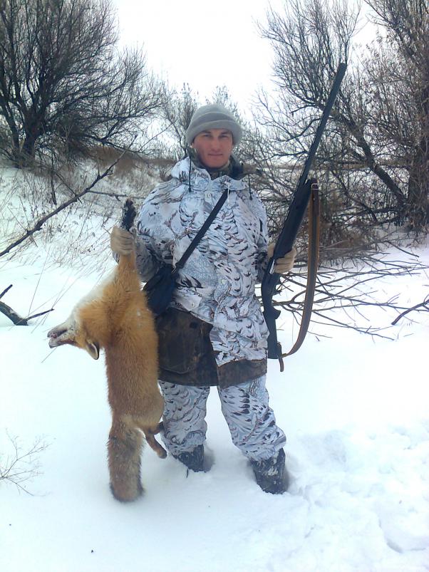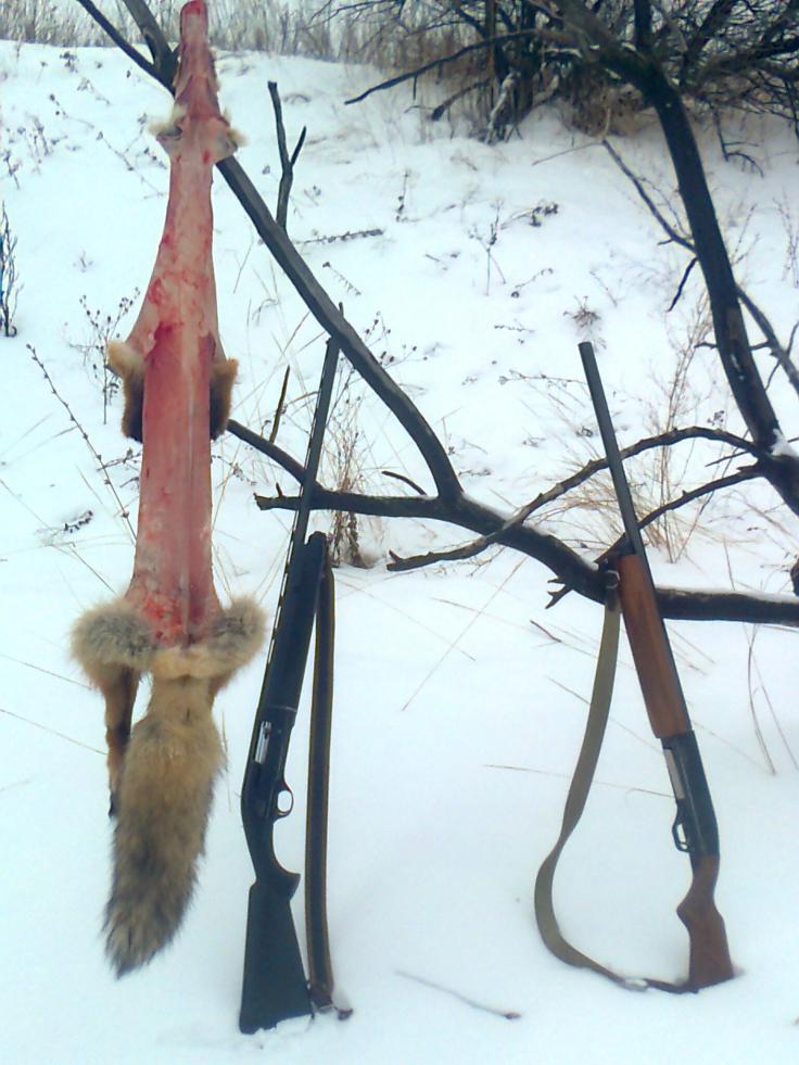 Был вчера на охоте.Снега свежего нет,следы все старые,но две лисы были добыты.Первую заметили в бинокль,пересекала поле.Товарищ быстро довёз меня до перпендикулярной лесполосы и я,как мог быстро,побежал ей наперерез.Вышла она от меня в 50м и остановилась,дала возможность нормально прицелиться.Один выстрел,одна дробина в голову(сам был приятно удивлён).Вторую выгнали из небольшого овражка,я на лыжах загонял,а товарищ стрелял.