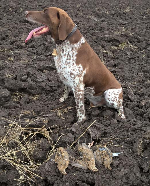 Днём отправились с кобелем в знакомое место поискать высыпки вальдшнепа-не нашли,а может нет его ещё-рано.На обратном кобель запросился на перепела- заехали.Как говорится "нет графини трахаем горничную".Подстрелили двух перепелов,третьего он просто поймал в траве без моего участия.