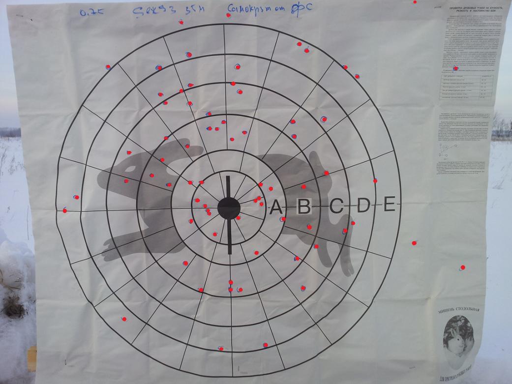 Вот пришли первые тестовые результаты, предоставленные Варягом, патрона, собранного: гильза Азот (12/76), капсюль сх2000 1,84гр, обтюратор резанный от Биора Феттер Н18, пыжи Диана Н8 + пробка Н6, контейнер от П/К Н10 от ГП. дробь №0(Бийск) 36гр (78шт) +0,7гр пробковый буфер, звезда с подкруткой (Гаеп BN4)