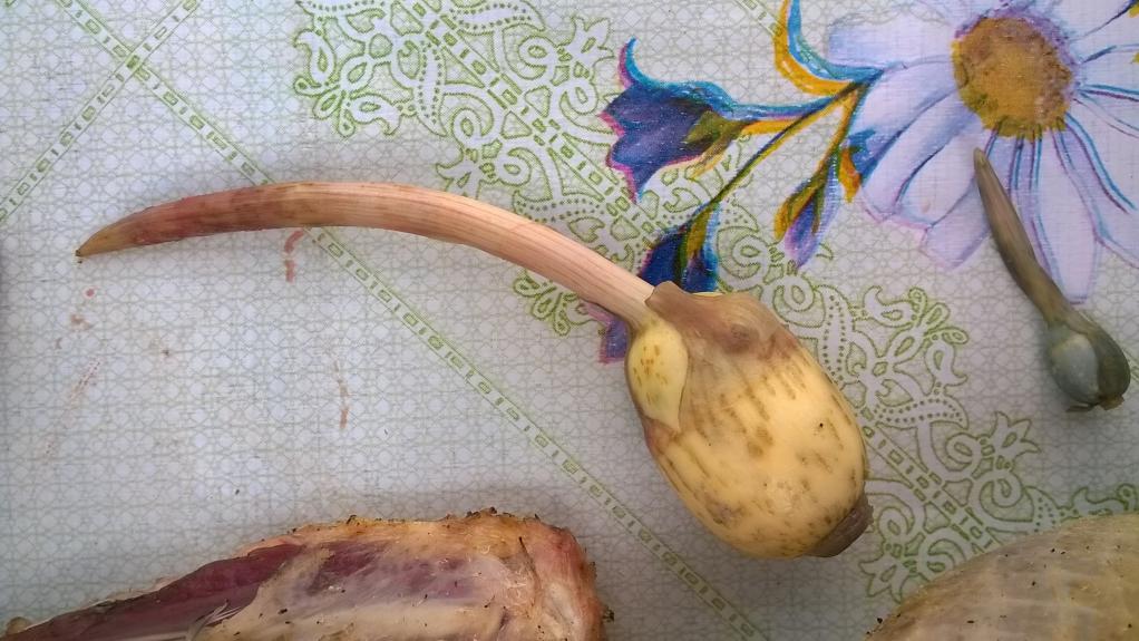 Вот сегодня утром с Гансом подстрелили ещё утку из стайки.Утка жирная и не пугливая,явно не местная,у нас таких нет.При потрошении обнаружилось что у неё в желудке (пупке) находится вот такая хреновина,та что побольше.Причём,её росток насквозь пробил стенку желудка,достаточно толстую у птицы.А та что поменьше находилась в пищеводе.Много чего повидал в битой птице,но такое вижу впервые.Что это-кто знает?
