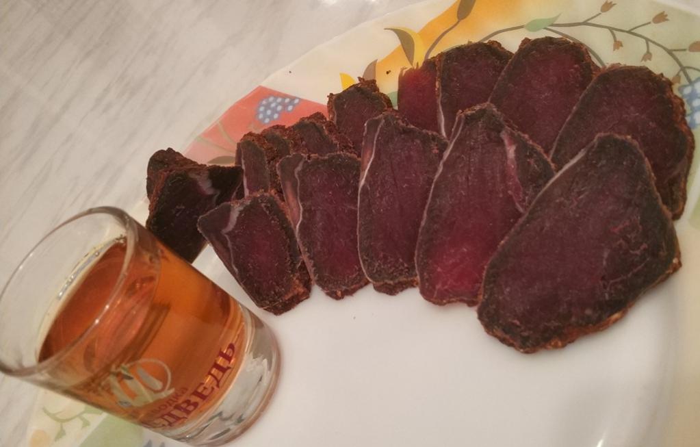 Лось вышел в 4 загоне....))) Бастурма! Непередаваемо вкусно! Солил долго (суток 3), потом отмачивал 9 часов. Обтер бумажным полотенцем и в приправы - чаман, паприка. Супер вкусно, а цвет то какой получился!!!