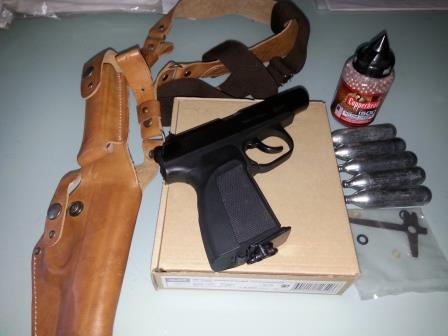 Пистолет МР454К исп. 10 выпуска 2009 года (на коробке клеймо), покупался в 2010. Малострелянный - сколько не скажу не помню - он в основном в шкафу в кобуре провисел. Практически не потерт. Состояние стоковое - ничего не делалось с ним абсолютно. Коробка, паспорт, штатный ремкомплект с отврткой, кожаная наплечная кобура ХСН в состоянии новой, 5 баллонов Crossman, банка 1500 шариков, ну может немного початая. Где-то на даче вроде есть еще одна такая же - найду - отдам бонусом следом. Ну по цене - пусть стартовая будет 4000.