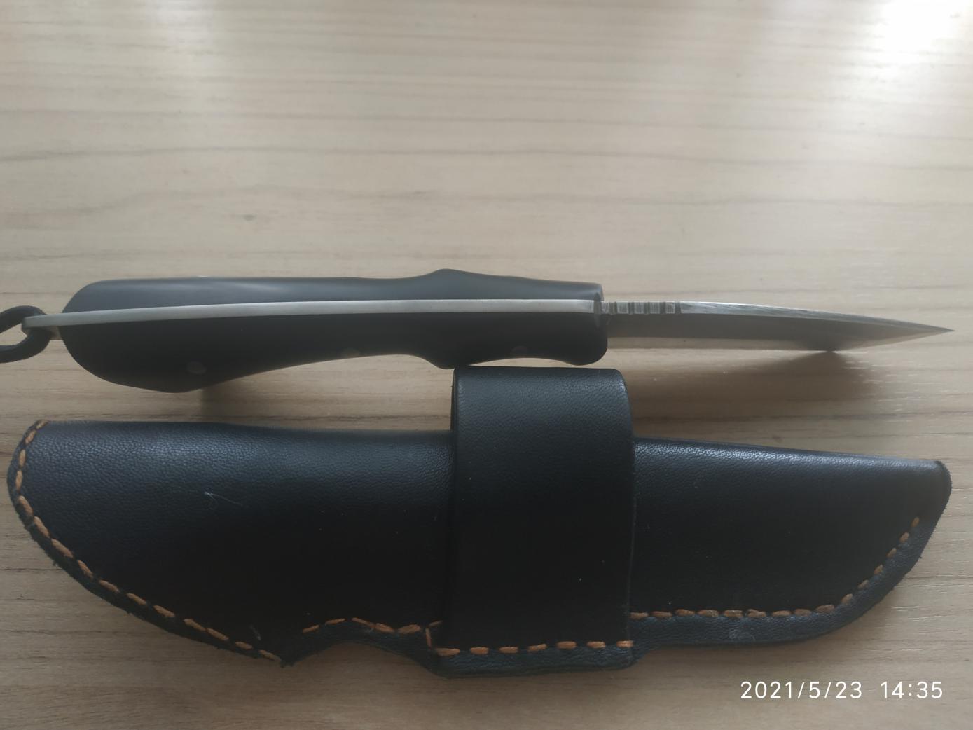 Продан. Нож изготовлен на заказ в единственном экземпляре.Длина лезвия 95 мм, ручка 110 мм, обух 2,6 мм.Сталь 65Г , закалка+отпуск, воронение,ручка накладная эбонит. Чехол натуральная кожа.Нож новый.Без торга. Цена 3000р т.89023750091
