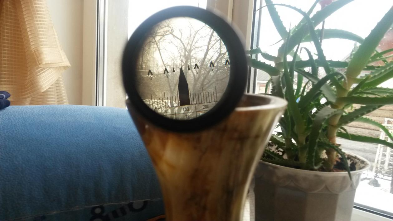 С карабином достался прицел, а что за оптический прибор не пойму. Вроде похож на ПУ, но сетка странная. Может кто знает кто это. Год выпуска 1961, клеймо серп и молот.