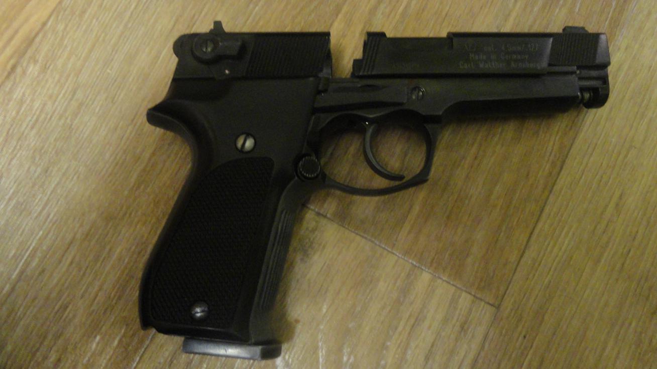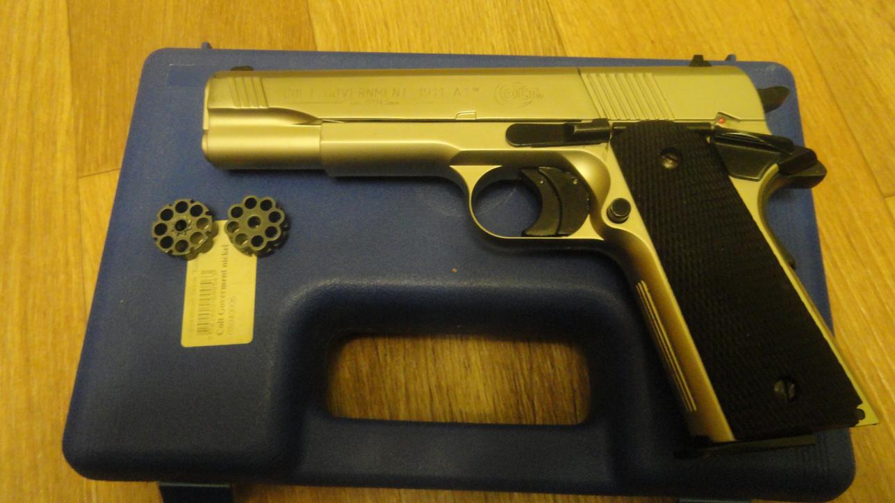 1. Umarex Colt 1911 в никеле. Самовзводом стреляет четко, с предварительного взвода иногда курок сам срывается. Автоматический предохранитель в рукояти упразднен, курок нарощен болтиком.