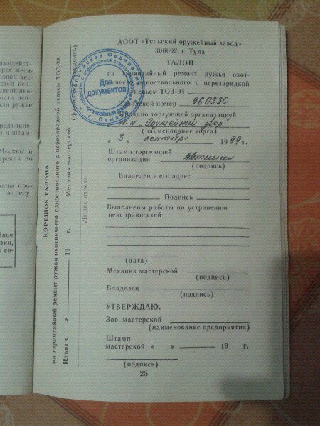 Продам ТОЗ-94 кал. 12-70. Перезарядка цевьем, год выпуска 1996, год продажи 1999.Цена 5000р. Ремень и чехол в подарок. тел 89276пять6318два Егор Возможна продажа с сейфом