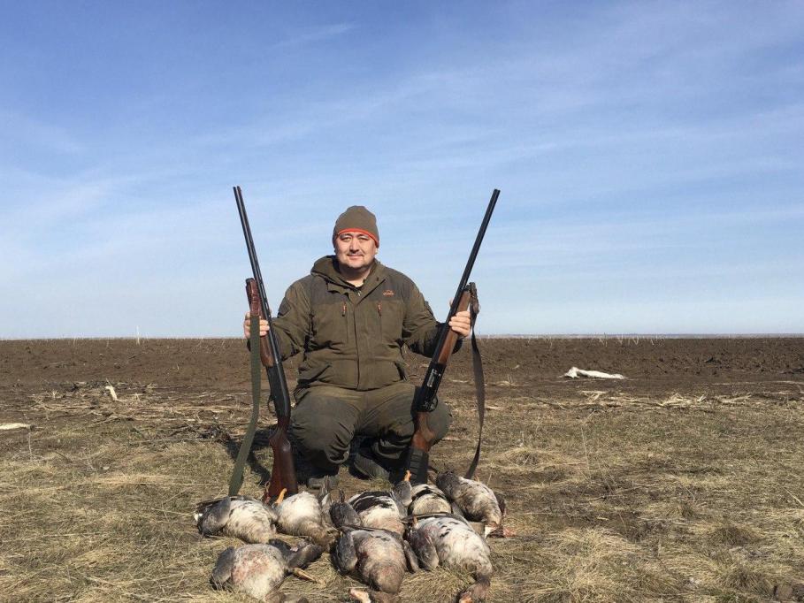 Решено было искать дальше, на мотав еще пару сотен километров нашли интересную присаду "гуси-лебеди" В ночь как положено окапались, благо оренбургская земля с песком. Очень опасались что будут конкуренты, но как ни странно никого в округе не было, выстрелы слышны были только далеко, итого за два дня норму взяли, на двоих восемь белолобых Гусь идет весне дорогу!!! |