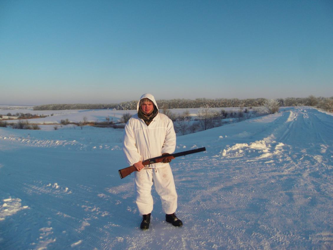 Когда начинал охотиться в магазинах мало чего было,купил масхалат белый из стекло ткани,не мнется,не рвется,только испачкался не много,один не достаток руки потом чешутся не много,если одеваешь без перчаток.