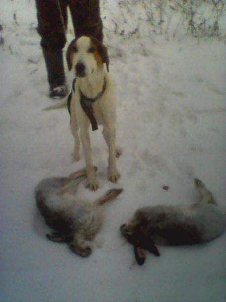 Ночью немного припорошило.Уехал к Шилану,там снег старый сохранился,корку припорошило.С голосом на удачу прошёл по опушкесначало по Висловской стороне,ничего.Перешёл на хорошенскую сторону.По опушке иду подбадриваю собачку,авось какой нибудь встанет.Снег лепит глаз не откроешь.Метрах в 40 отдал выжлец голос.Сначала добирал,затем залился.Ура,я уже не надеялся.Перехожу на просеку,гон на меня.Лиса в завалах валёжника мелькает.Вроде рядом ,но в таких крепях,что не поймаешь на мушку.Выжлец на хвосте.Завертелось.гон на слуху,Вот идёт на тебя,сердце как молот стучит,чуть в стороне проходит на виду ,но вне зоны доступа.Пропустишь,перейдёшь,а она зараза где стоял раньше мастерит.Через просеку за весь день всего два раза перескакивала.А так метров 10- 20 не дойдёт и назад.За день 7 раз перевидел.Раза 4 можно стрелять,но хотелось наверняка.Думаешь пормажешь ,уведёт выжлеца ,опять ночевать в лесу останется.Снег лепит,мокрый ,замёрз,а она как издевается,гон то удаляется ,то опять накатывает.Двига ться нельзя,хрустит наст.В 7 раз проводив взглядом,понял хватит,ещё раз перескочит,ловлю выжлеца,и домой,зубы стучат на весь лес.Гон ушёл и стих.Подождал 10 минут,начал звать,размялся чуть ,техонько пошёл к машине сам кричу.Прошёл метров 100.слышу чуть гон.и на меня.И бывает же такое целый день стоял не шевелясь и всё мимо,а это ,снег хрустит,я ору,а гон на меня.И опять метров 20 не дошла и мелькает между деревьев.Бот нулёвкой,заметалась и пропала.Выжлец уж тут,дошёл с голосом до места выстрела и замолк.Я дошёл до места где стрелял,гонный пошёл дальше,ну думаю промазал,надо ловить собаку,а сам по инерции иду по следам.Метрах в ста смотрю лежит в сугробе.Восьмой раз увидел её.Выжлец гонял порядка пяти часов,без перемолчек и сколов.Вот так бы в поле.Лиса крестовка.