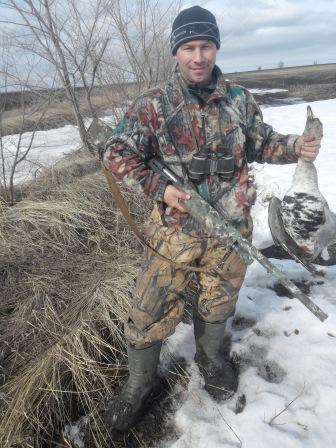 Ну что ж, напишу и я небольшой отчётик по открытию. Ездить искать гусика начали ещё за неделю, нашли, много… Приехали в пятницу, разбили лагерь, для тех кто хотел поохотить утку - нашли озерцо, которое уже вскрылось и небольшие разливы, бросили чучела определили места где спрятаться можно. А сами смотрим где над полями идет основной пролет. Определили где коридор и в ночь уехали копать. Нашли в темноте котел, ор гусинный стоит аж в ушах закладывает. Не доезжая до предполагаемого котла где то 700 – 800 м, приняли окапываться на перепаханном поле, как раз на трассе гуся. Ну кто копал тот поймет, какая это нелегкая задача, по ночи месить чернозем. Нас было трое, выкопали 3 окопа, как смогли замаскировали землю. Выставили чучела. Все подготовили, поехали в лагерь. Поспали 1,5 часа и в путь. Так получилось что доехал до места я один, мой напарник уехал дальше в посадку, причины не важны, важно следствие… Гуся было море, тыщи и тыщи, направление мы угадали и место тоже, шли и высоко и низко, ноооооо не долетая 200 – 300 м уходили в высь…. Посмотрев со стороны стало понятно что пугает… маскировка, с большой буквы М была никакая, кучи черной земли, все вокруг вытоптано, не закрытые 2 свободных окопа, короче говоря утрянка была потеряна…. Вернувшись в лагерь, немного смазав разочарование, обсудив недочеты, приняли решение потратить больше времени и качественно подойти к маскировке. Поехав на место ночной «стройки», и хорошенько осмотревшись, в километре нашли поле скошенной кукурузы и подсолнуха. Начали копать, взяли мешки и вывозили землю, долго, скрупулезно, но мы это сделали. Подготовили из сетки накидки, замаскировали их скошенными стеблями кукурузы. Расставили чучела по специальной методе, которую где-то вычитали. Вернулись в лагерь где-то часа в 4 дня, быстро поели, перебрали патроны и в бой, на подъезде к нашим окопам из далека уже было видно что ОН там, стайки кружились, кто то присаживался…. Ляпотаааа. Сели и начали манить, но гуся на вечерке было очень мало по сравнению с тем что творилось утром. Но он был, первые же налеты показали что с маскировкой все гуд, гусь подвоха не чувствует и налетает отлично. За вечерку взяли одного и было много досадных промахов, в след раз нужно ставить в стволы цилиндры и брать патроны без контейнера, на коротке самое то будет, ну и конечно практика и тренировка стрельбы.