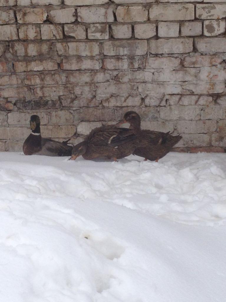 Съездил сегодня проведал своих. Подрезал крылья. Ногавки надел. Выпустил на снег. Купаются, жрут как бульдозера. В сарайчик возвращаться не хотят.