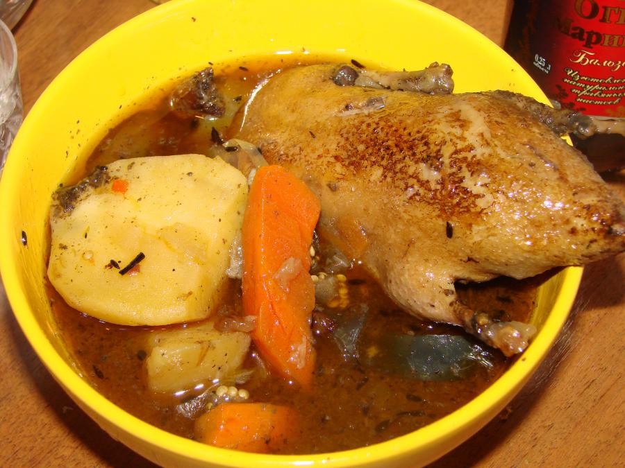). Чугунный казаночек для плиты на 6 литров, птички замачивались с прошлого вечера в холодной водичке с регулярной сменой оной. Итак, на дно разогретого казанчика чутка маслица (чирочки уже жирные) растительного и в нем слегка обжарить птичек целиком (4-5 мин). Убираем дичь и кладем лук (много!), спасеровали и морква (крупно! вообще, все крупно!), обжарили с добавлением зиры и семян кориандра. Потом водички, барбарисика, птичек обратно и тушим без крышки минут 30. Потом перец болгарский, крупнорезанный картофан, пару резанных крупно помидорок, мелкорезанный чесночек, соль, накрываем крышечкой и на медленном огоньке еще минут 20 готовим овощи. Добавить лаврушку и дать настояться еще пол часика.