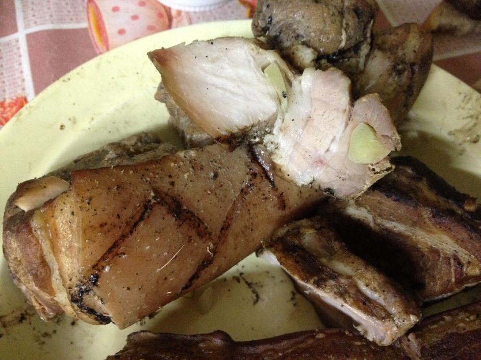 И так! Времени на засолку перед копчением нет, он же стоит жрать просит. Решено было просто напихать много чеснока посолить в меру и перчик молотый, все. Че будет то будет. Да и на батарее в пакете полежало 4 часа. Каждый час переворачивал.чтоб побыстрее просолилось.