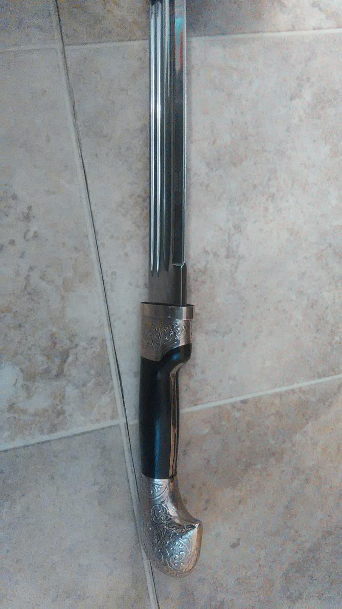 Продается шашка "ТКВ-1". Полная длина:1015 мм. Длина клинка:845 мм. Клинок: коррозионно-стойкая сталь. Был куплен в Дагестане в июне 2015 года. Имеется гарантийный талон и печать магазина. Цена 15000 рублей. Продает товарищ. Телефон: 89371812738