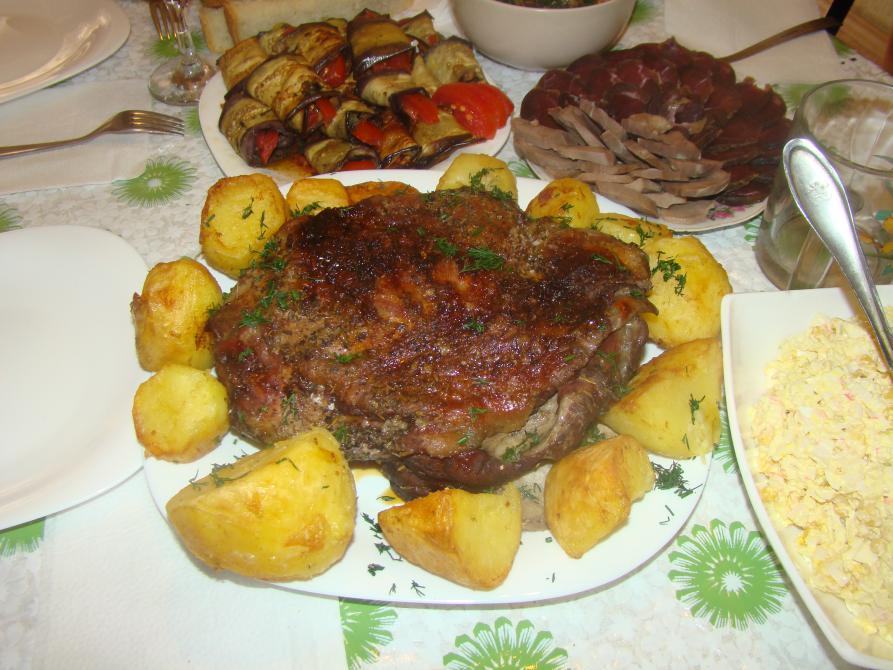 Берем лопатку молодого свина, шпигуем кусочками чесночка, наттираем оливковым маслом и прованскими травами (ну люблю я их