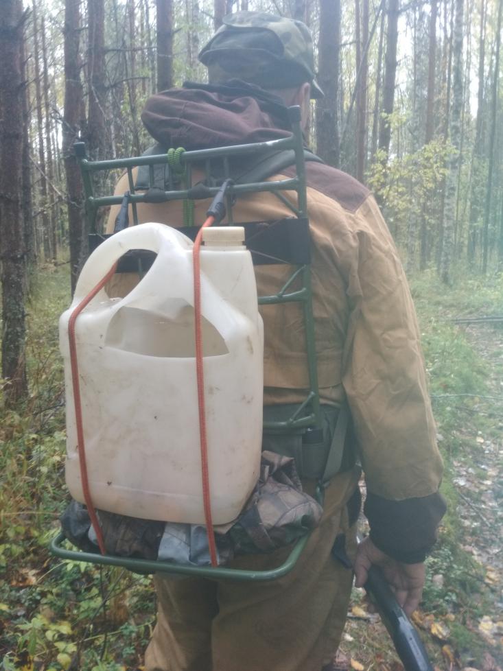 Если вышел на радиалку, то вес минимальный. Пояс конечно работает, но он нафиг не нужен. Поясница с ним потеет. Лямки подойдут потоньше, чтобы вкладке не мешали. Зато к рамке привязал дождевик и бутылку с водой, и алга. Потом к ней можно подвязать птичку. Мы вот нашли в лесу пустую канистру, взяли с собой. Речку не нашли, зато вырезали окошко под грибы. Тоже неплохо.