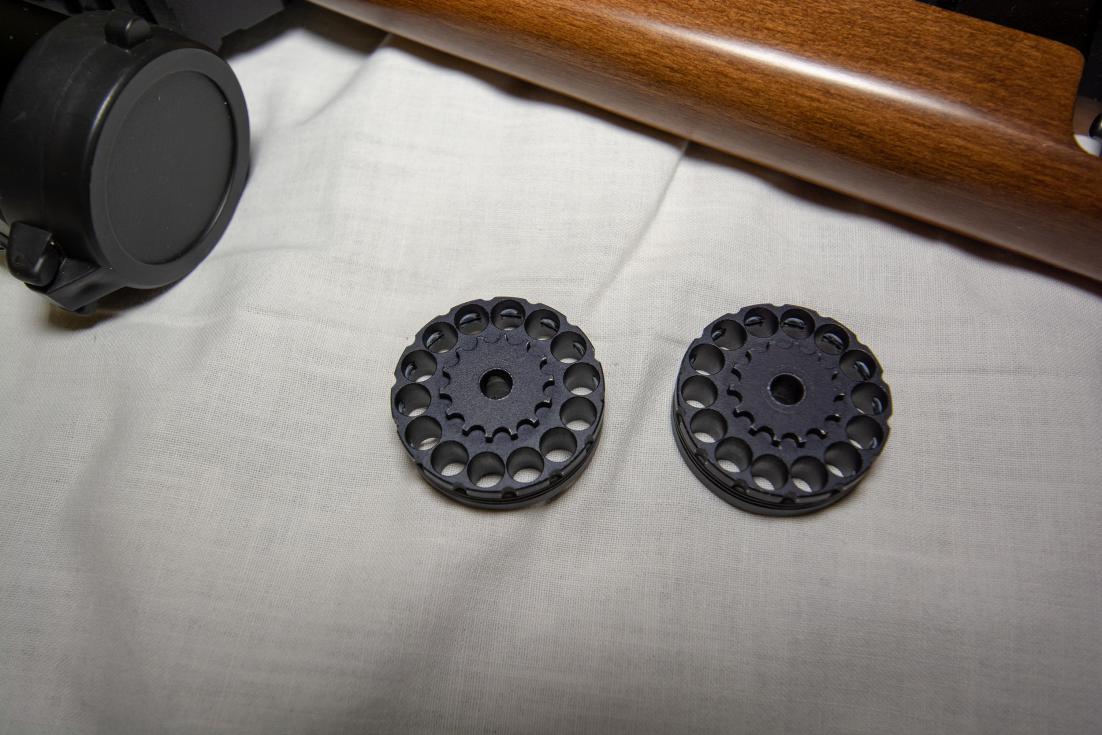 Одна ячейка под барабаны заклеена, плохо магнитилась. Есть потертости снизу рукоятки взвода и одна коцка справа на ложе. Кажется, след от вражеской пули. В остальном все идеально, кладет пулю в пулю на 30 метров (плохое зрение, поэтому так пристреляна).